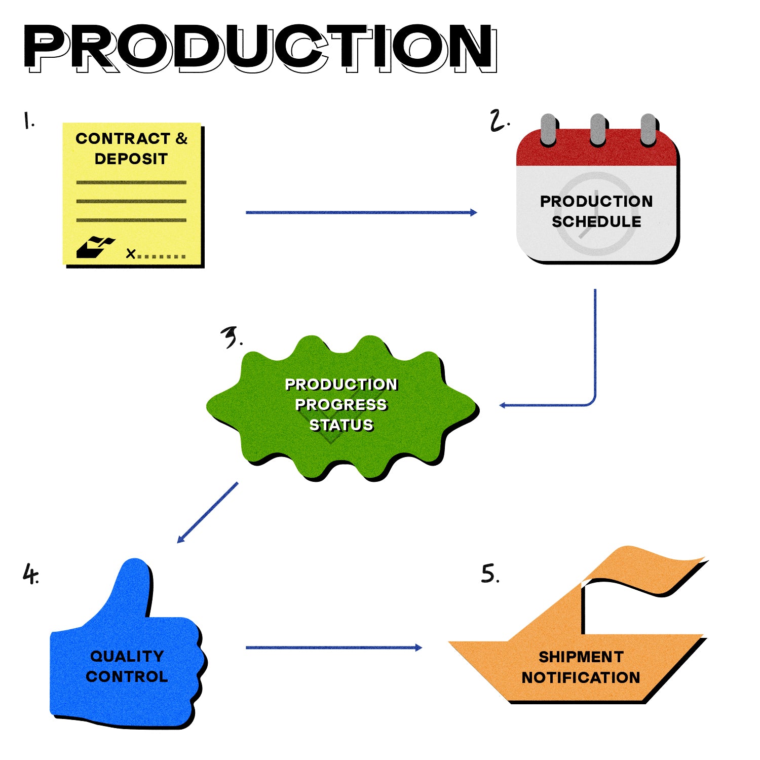 After signing the contract for the styles ordered and submitting a deposit, we begin production and provide a production schedule.
