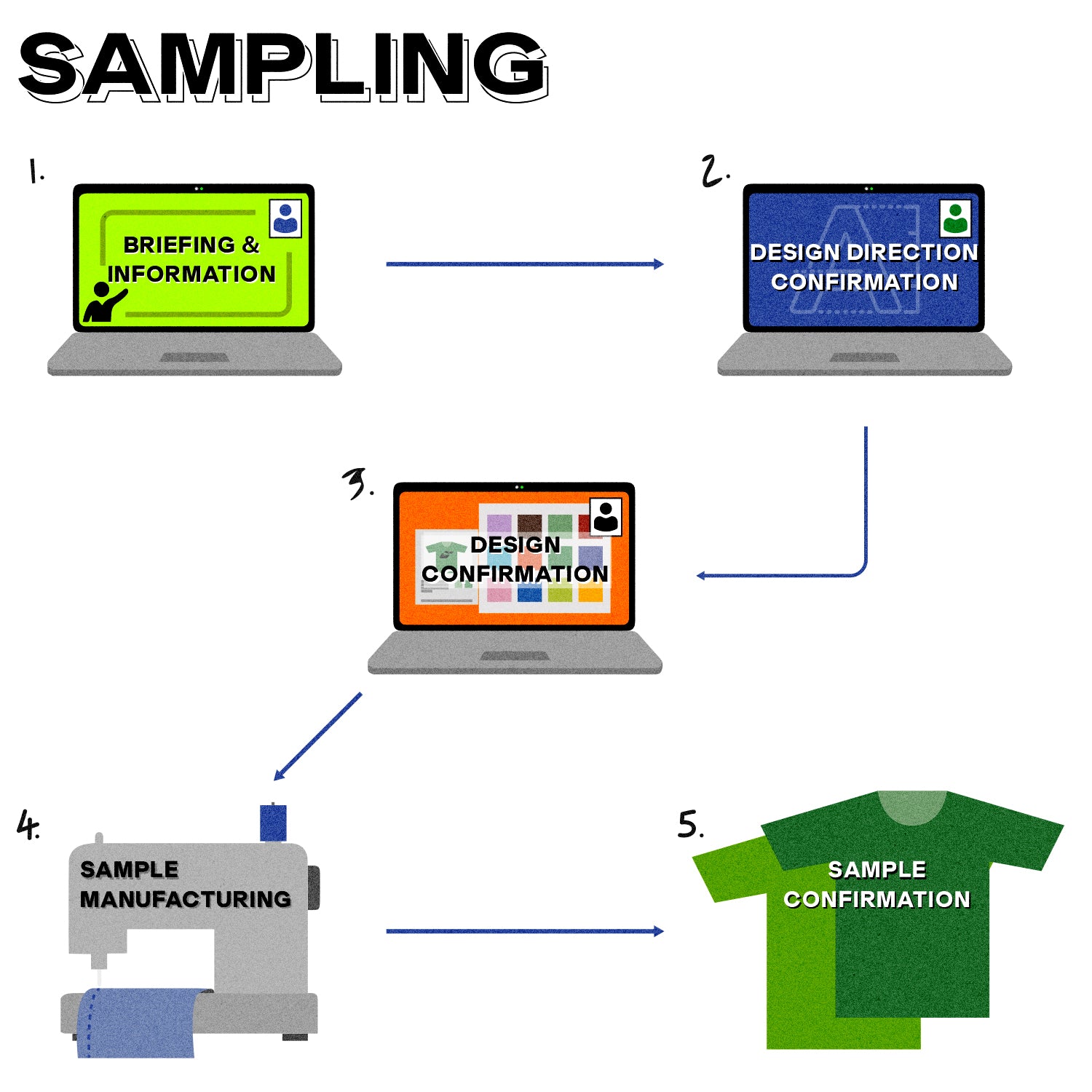 Upon confirming the design drafts, we proceed with sample production. The time frame for sample production varies: 3-7 days for T-shirts, shirts, shorts, and pants, and 7-14 days for cotton clothes, jackets, sweaters, and stormwear. Note that sample times may vary depending on the complexity of the style.